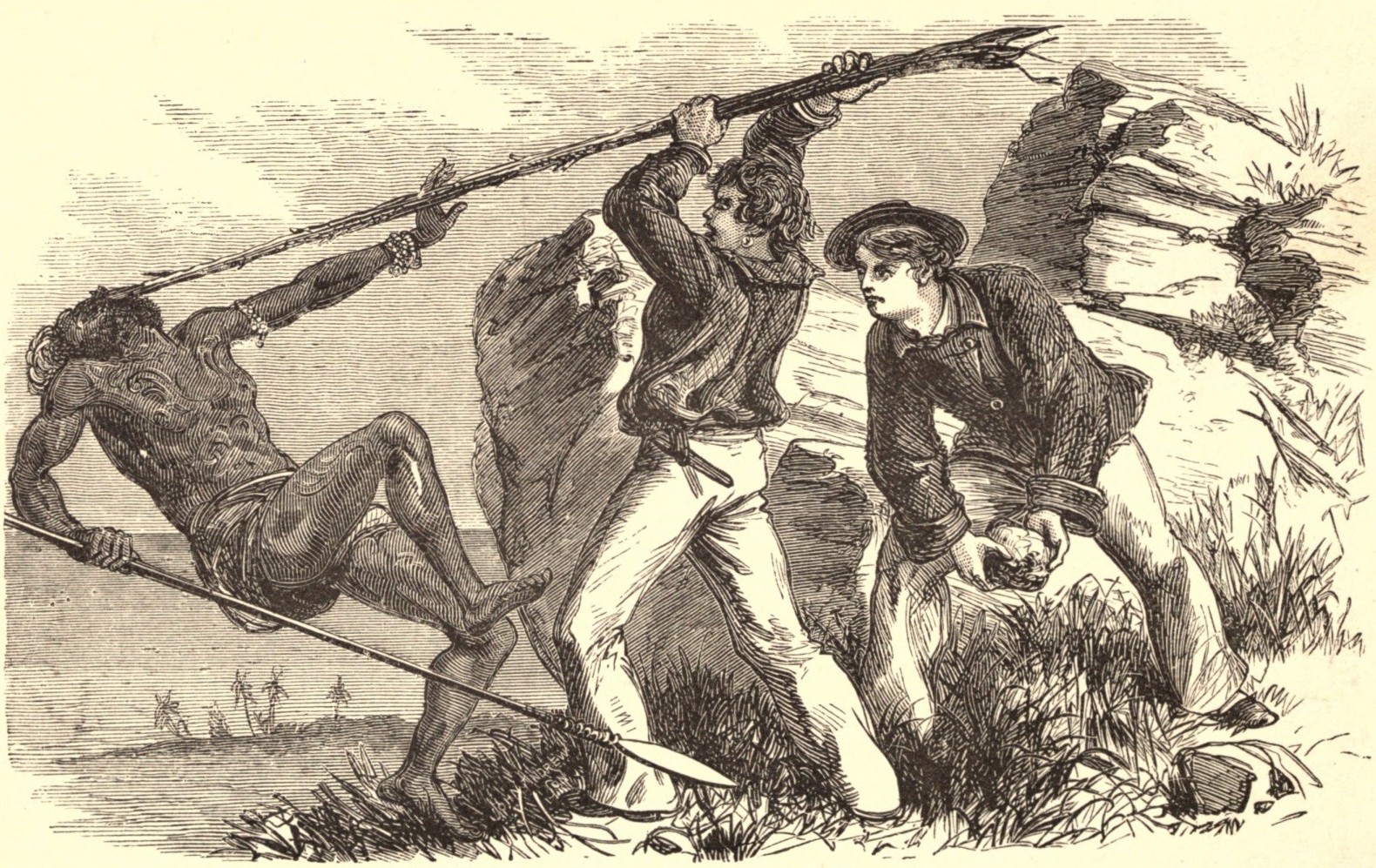 In this longitude we hauled on the southern tack, running near Lord Howe's group and through the Solomon Archipelago. We took three small whales so near to one of the former, that, when the third one turned up, he was within less than a hundred yards of the reef, the savages yelling at us from the shore. The ship was about a mile and a half from us, with two whales fluked alongside, and carrying sail to hold her position. As the old man dared not run off to take the third whale alongside, he sent the other two boats to our assistance, with orders to tow the whale on a wind. We set our sails and took the oars, and accompanied by howling barbarians both on shore and in canoes, we towed the whale about ten miles to the southward, until clear of the island and adjacent reefs, so that the ship could come down to us without danger. During the four or five hours that we were thus employed, those in the canoes kept within a short distance outside of us, while their comrades on the beach, women, children, and all, travelled along shore abreast of us, an infernal serenade rising on both sides of us without cessation. They would have attacked us if they had dared; but, though of course constantly on our guard, we did not much fear them. They mustered about fifty canoes, containing between two and three hundred warriors, but dared not venture within reach of our whaling weapons. They at one time seemed to be making preparations to give us a volley of stones, at long shot, but the captain, seeing a suspicious movement among them, fired the six-pounder, which was kept trained upon them all |