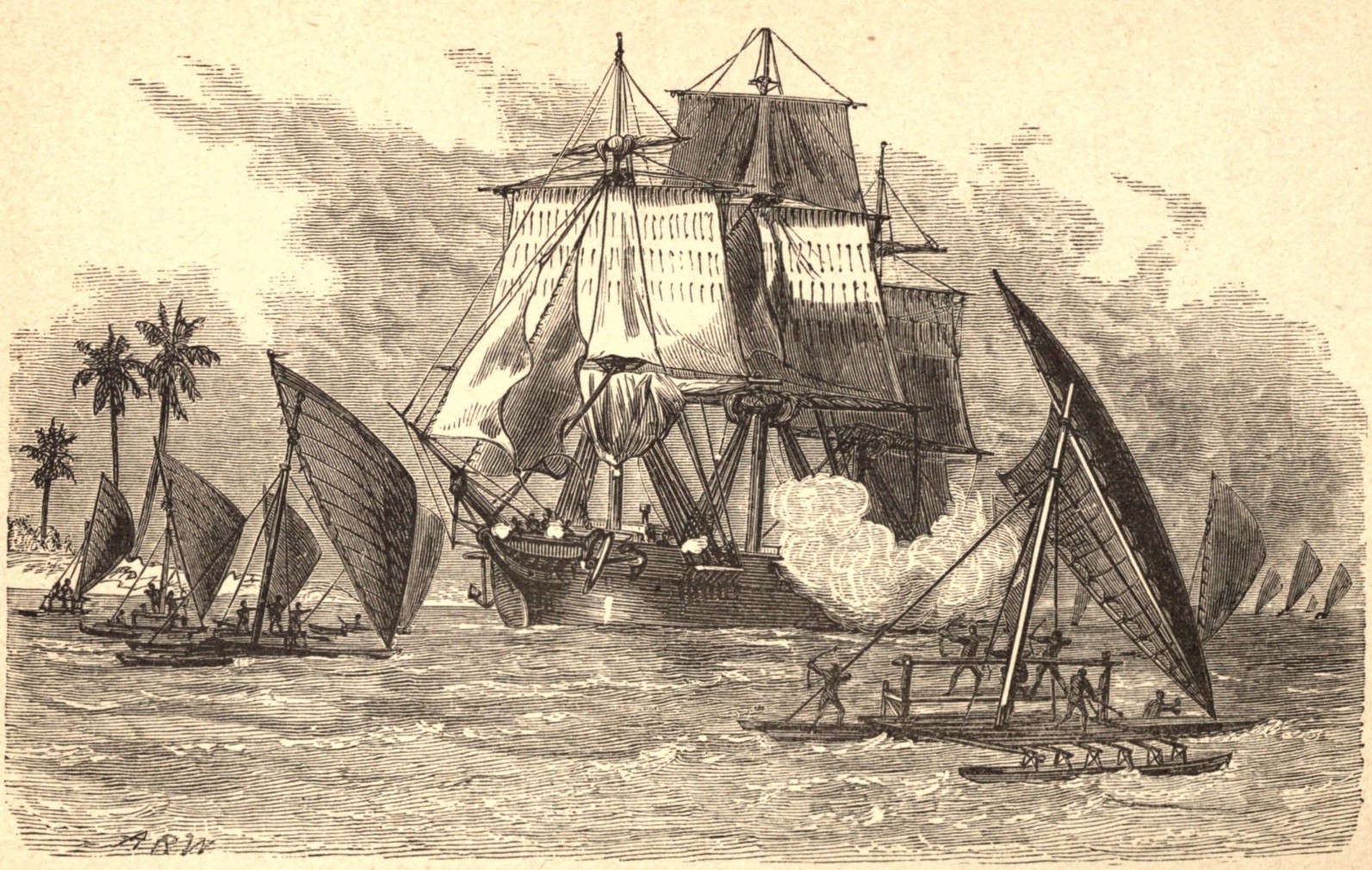 tale. They had even destroyed the ship's chronometers, supposing them to be alive; for King George when questioned by Captain Courtenay concerning the chronometer of the Harriet, answered expressively, "Kill him. Take big stone, kill him." The Seringapatam still lay wind-bound for two or three days after our arrival, but at last, taking advantage of a morning when the air was quite light, though blowing directly into the bay, we put the boats of all three ships ahead of her, and assisted by the whole flotilla of canoes we towed her to sea, keeping the sails furled, and the yards pointed to the wind. We thought King George seemed rather relieved when he got rid of her. He professed great friendship for Captain Courtenay. But his regard was, doubtless, based on the wholesome fear in which he stood of him; for the ship mounted eight guns in regular broadside, besides small swivels on her topgallant forecastle and taffrail, and even had her arm-chests in her tops. We were successful in reaching and repairing the injury under our counter, and, on righting and trimming the ship, had the satisfaction to find her bottom perfectly tight. We could not, of course, tell how much external injury she had received under the bow. I did not fail, on going ashore, to notice the stone walls of which I had heard, and in which I observed some stones of great size and weight, at such heights from the ground as would indicate that the builders must have made use of mechanical power to raise |
