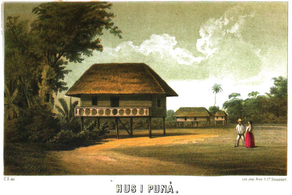 Puná by är belägen på ön af samma namn och består af omkring ett dussin hus med ett par obetydliga inhägnade täppor. Husen äro alla byggda på stolpar, för att gifva luften tillträde på alla sidor och hålla rummen fria från väta. Medföljande planch ger bättre än en beskrifning begrepp om deras utseende, men vi måste upplysa att det här afbildade hus är ett af de bästa i byn. Det inre är öfverallt högst tarfligt: möbleringen består på sin höjd af några stolar och bänkar, ett par hängmattor och en kista. Till spis begagnas några flata stenar, och husgeråden inskränka sig till ett och annat kokkärl och några kalabasser. Några egentliga odlingar syntes ej, oaktadt dylika med största lätthet skulle kunna göras. Någon frukt var ej att få, med undantag af några bananas. En half mil från byn vid Punta Espanola har engelska konsuln i Guayaquil ett landställe, hvarest han en gång försökte odla bomull, som väl vexte förträffligt, men ej kunde skördas i anseende till brist på arbetare, ty Puná-boerne tyckte sådant arbete vara dem alldeles för besvärligt. Från byn går en liten gångväg till detta ställe, men man får dock litet emellanåt tränga sig fram bland de talrika busksnår och slingerväxter, som på många ställen stänga den. En slags ranka, med blad liknande nässlans, var ganska besvärlig, ty dess blad fastnade vid kläderna så starkt att de först efter flera tvättningar voro riktigt borta, och lemnade då efter sig fläckar som tyckas vara outplånliga. För botanisten erbjuder Puná säkert ett rikt fält. Pockenholz och flera arter nyttiga träd växa derstädes i öfverflöd, men skogens täthet gör deras uppsökande och forslande till stranden ganska besvärligt.