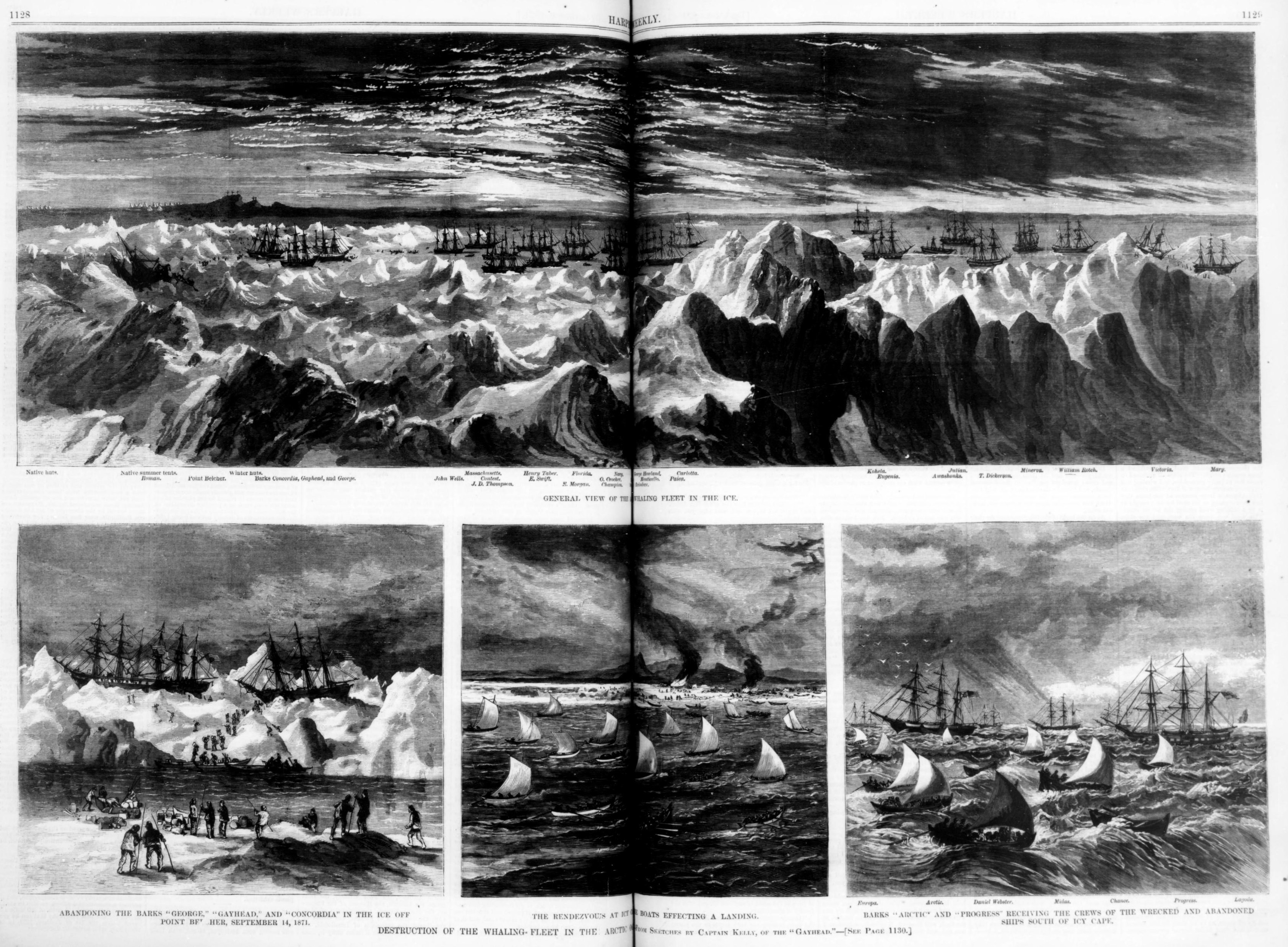 Of the arctic whaling fleet, forty in number, which proudly sailed on their perilous voyage from San Francisco and Honolulu last season, thirty-three have been crushed in the ice, and their crews have barely escaped with life through many hardships and perils. The tidings of this catastrophe were brought to Honolulu on the 23d October; and on that and the following day no fewer than 1200 shipwrecked mariners were landed upon the Hawiian shores. The particulars of this crushing blow to the whaling enterprise of America may be gathered from the following details, supplied to us by Mr. Thomas G. Thrum, of Honolulu, to whom also we are indebted for the several graphic sketches of some of the frighful situations of the fleet and its distressed crews which appear in our opening pages this week. Early in May the whalers arrived at the south of Cape Thaddeus, where they found the ice; but it was so closely packed that they were unable to make much headway northward, and the wind was strong from the northeast for most of the month. June commenced with light and variable winds and foggy weather, but the ice opened somewhat, and the ships made up in sight of Cape Navarine, where five or six whales were taken, and many more were heard spouting among the heavy ice, but they soon left. Toward the middle of June the ice opened, enabling the fleet to pursue their way north, picking up a few whales in crossing the Anadir Sea. When the ships made Cape Behring, the whales had mostly passed through the straits; the fleet had also passed through by the 30th June. They now commenced catching walrus, but with small success in comparison with former seasons. In the latter part of July strong winds prevailed from southeast and northeast, breaking up the walrus hunting; so the fleet pressed to the north-east for Icy Cape. Finding the ice disappear from the east shore south of Cape Lisburne, the fleet pushed to eastward, following the ice, the main body of which was in latitude 69° 10’, in to the east shore, where they found a clear strip of water running along the land to northeast, and in this water the whalers worked up to a few miles off Icy Cape. Here some of them anchored, being unable to proceed further through the ice lying on Blossom Shoals, the wind at the same time blowing strong from the northeast. the wind moderated, and the ice started off the shoals about the 6th of August. In a few days most of the fleet reached north of Blossom Shoals, and the weather being favorable, they worked up to northeast, making Wainwright Inlet, where they captured a large number of whales, though many more were lost, the ice being very heavy and densely packed; but notwithstanding this, the prospects appeared good, and promised a large season's catch. The ships all anchored or made fast to heavy ground-ice, and whaling was continued smartly for several days, when, about the 11th August, a large number of the boats that had been cruising in the open ice were caught in it by a shifting wind setting the ice on shore. This wind was from the west, and the ships were compelled to get under way to save themselves from being jammed. They worked in-shore under the lee of the ground-ice, and it was only with the utmost difficulty that they succeeded in saving the boats, having to haul them for long distances over the ice, which now set steadily on shore; and, to avoid being stove, the ships got into shoal water. On the 13th the ice stopped, having at last grounded, leaving an open space of water along the land up to Point Belcher. The boats were kept off whaling continually, and plenty of whales were heard and seen among the heavy ice, but were inaccessible. Up to the 25th of August the ships remained safely anchored and tied up to the ice, waiting for a strong northeaster to open up the ice off the land. On that day a strong northeast gale set in, and the ice opened and went off shore. On the 27th the weather was good, whales plentiful, and many were taken: and as it was considered that the ice was going off permanently, the ships all got under way, and began whaling in earnest. They had fine weather and light, variable winds on the 28th; but on the 29th a southwest wind, light in the morning, freshened so toward the evening that the ice set inshore, and caught some of the ships in the pack, while the rest barely succeeded in retreating inshore ahead of the ice, where they anchored in from three to four fathoms of water, the ice still coming in, and small ice packing round the ships. By the strong current which ran to the northeast the large, heavy floe-ice grounded in the shoal water, and inside of this many of the ships lay, while those which could not get in kept working in, as they found it possible, to prevent staving. Storms and winds from south to northwest, with snow, now visited the devoted vessels, many of which were so close together as not to have room enough to swing clear of each other. And now a series of disasters began, which culminated in the almost total destruction of the arctic whaling fleet. On the 2d of September the brig Comet was completely crushed in the heavy ice, her crew hardly escaping to the other vessels. The ice, too, began to set on shore heavily, and the open space of water becaitie gradually narrower, and the possibility of the vessels getting out grew less and less. Still our brave Mariners cherished strong hopes that a northeast gale would yet open a way for their passage. Indeed, though dav after day went without any sign of the ice opening, the brave men were more anxious about the loss of time than their apparent danger – so unwilling were they to believe that the ice would not go off shore, as in all their former experience it had done under similar circumstances. Nothing, however, could be viewed but ice off shore to the utmost range of vision, and the only clear water to be seen was that inshore, and which had become narrowed to from two hundred yards to half a mile wide, where the
