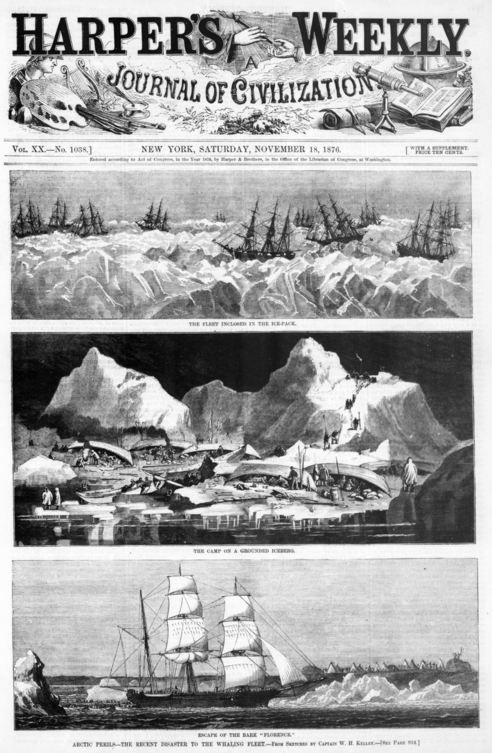From Captain W. H. Kelley, master of the whaling ship Marengo, we have received the series of sketches printed on our first page, representing successive scenes of the recent disaster to the arctic whaling fleet. The first sketch shows eleven of the fleet of twelve ships inclosed in the ice-pack and abandoned by their crews. The twelfth, the bark Florence, was so fortunate as to get inshore, under the lee of a grounded iceberg, and thus escaped the pack. The second sketch shows the crews encamped on the southeast side of a grounded iceberg, where they found shelter from the bitter wind. Many of the men were utterly worn out with the severe labor of hauling the boats and carrying packs over the broken ice, and lay down under the boats to get such rest as they could on the bare ice. On the following day they made their way to land, at times dragging the boats over the ice, and at times finding strips of water. On reaching Point Barrow, where there is a native village, the shipwrecked men set about building two houses for winter-quarters. In this labor they were assisted by the natives, who lent them their dog teams to draw drift lumber to the site of the houses, and otherwise treated them with great kindness. Fortunately a northeast gale at length moved the pack ice, and the crew of the Florence, which had remained snugly anchored under the protecting lee of the grounded iceberg, had nothing between them and the open sea but a strip of ground ice. With great labor a channel was cut through this strip and the bark was liberated. As soon as she was out in open water the crews on shore were signaled to come on board. House-building was at once abandoned, a rush made for the boats, and after a pull of about ten miles, the men who had expected to pass the winter on Point Barrow found themselves once more afloat and homeward bound. But for the providential escape of the Florence, we might have had a worse disaster to record than the loss of the ships.